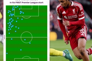 体育资讯3月16日讯 恩古莫哈在利物浦1-1热刺的比赛中首次在英超首发,英超官方晒出了他的热区图。
