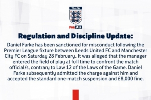英足总发布公告:“丹尼尔·法尔克因在利兹联对阵曼城的比赛结束后存在不当行为而受到处罚。据指控,该主教练在全场结束时进入比赛场地与裁判发生对峙,此举违反了《足球竞赛规则》第12条。丹尼尔·法尔克承认该项指控,并接受标准的一场停赛处罚,以及8000英镑罚款。”