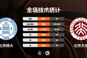 末节比赛,北京师大率先发力将分差追到个位数,但这个势头并没有延续太长时间,及时调整的北京大学此后打出一波小高潮稳住局势,他们在节末轰出一波流带走比赛,最终北京大学大胜北京师大继续保持不败。