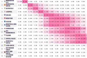 体育资讯04月13日讯 英超第32轮,曼城3-0大胜切尔西,opta更新了英超夺冠概率,依旧看好阿森纳,夺冠概率为87%。