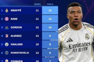 本赛季欧冠射手榜:姆巴佩15球居首,凯恩12球次席,小蜘蛛9球